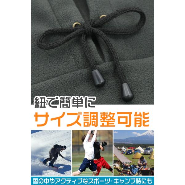 紐でサイズ調整できるので、雪の中での着用やアクティブなスポーツ、キャンプ時などの着用にもおススメ。