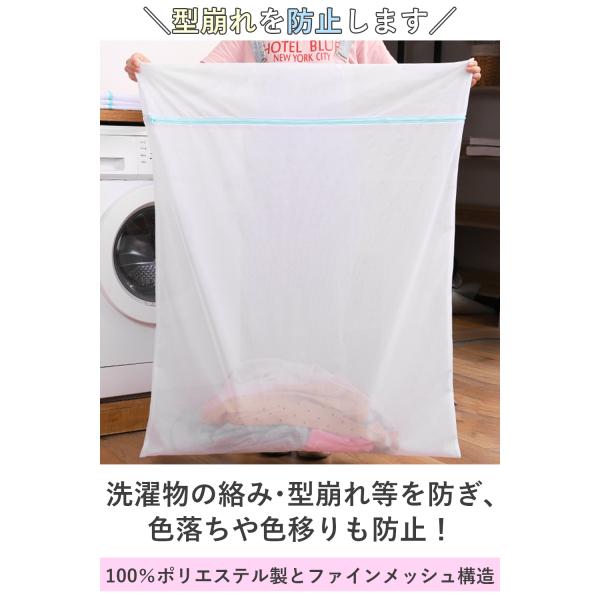 洗濯ネットは100%ポリエステル製とファインメッシュ構造で、洗濯物の絡みや型崩れなど防ぎ、色落ちや色移りも防止できます。