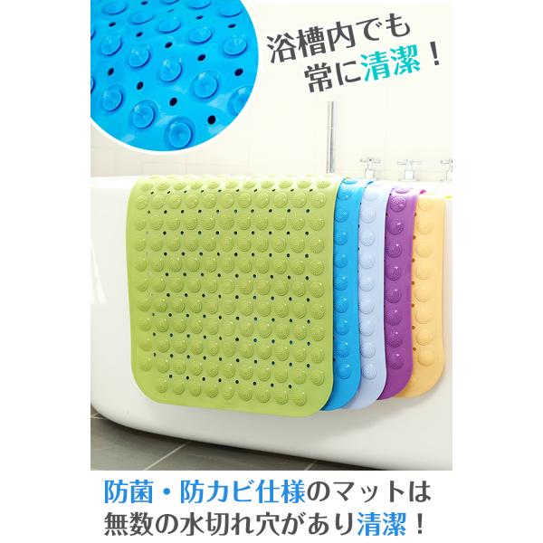 防菌・防カビ仕様のマットは無数の水切れ穴を施し、浴槽内でも常に清潔に保ちます。