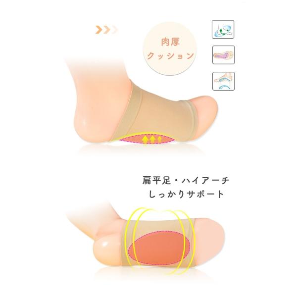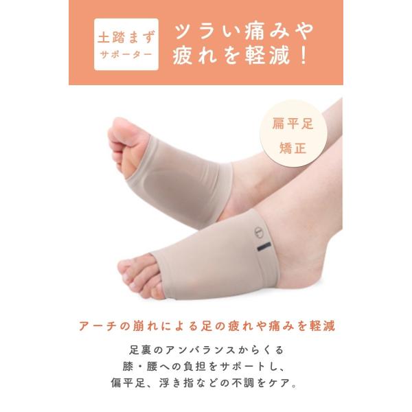本サポーターが縦アーチを形成し、土踏まずの衝撃を緩和し、扁平足・ハイアーチなどによる足底部の痛み、だるさをやわらげます。