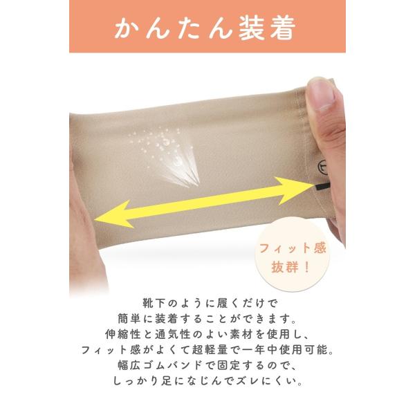 幅広ゴムバンドで固定するので、しっかり足になじんでズレにくい。