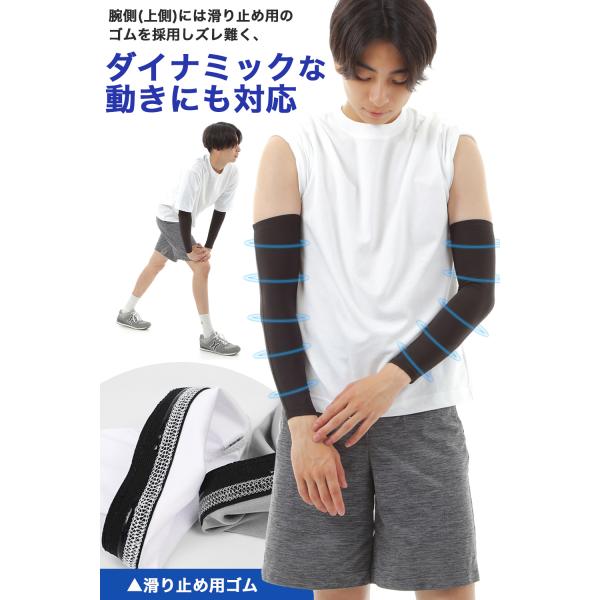 腕側(上側)には滑り止め用のシリコン入りゴムを採用しズレ難くダイナミックな動きにも対応長時間の着用やアクティブ・ダイナミックで激しい動きを必要とするスポーツに最適腕にしっかりと固定し、ズレを長時間・有効的に防止できます。