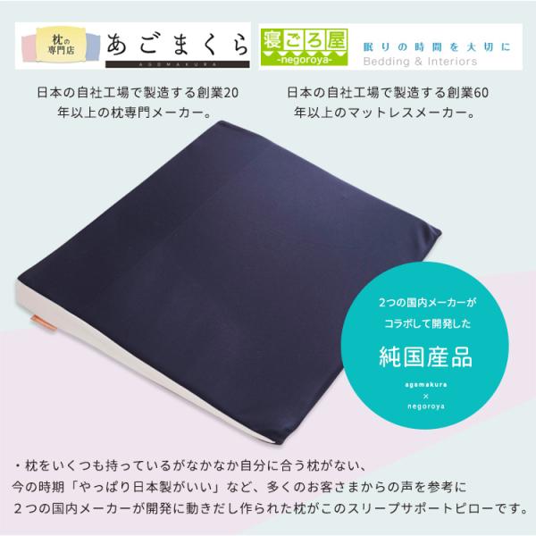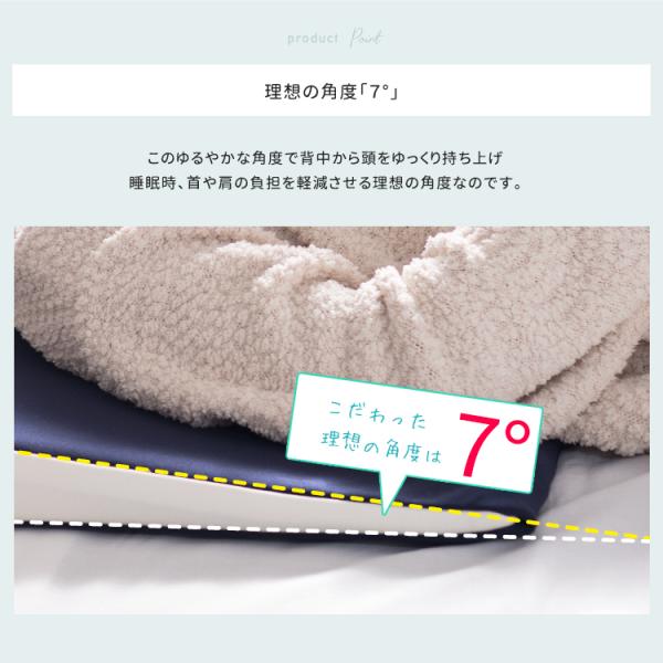 背中から緩やかな角度をつけ上体を持ち上げることにより、 首や肩の負担を軽減させ睡眠を助けるための枕