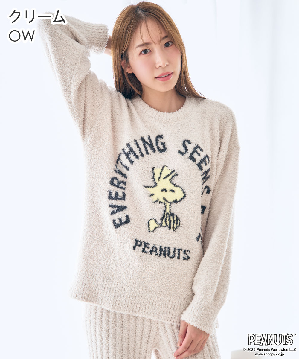 人気コミック『PEANUTS(ピーナッツ)』に登場するスヌーピー、ウッドストック、ベルをあしらったシンプルで大人可愛い上下セットのルームウェアです。おもわずギュッとハグしたくなる、ふんわりもっちりとしたマシュマロのようなさわり心地のニット素材で、秋冬の肌寒い季節にもあたたかく過ごせます。大きすぎないゆったりとした程よいサイズ感で、部屋着やパジャマ代わりのナイトウェアとしても最適。トップスはカラーによって異なるイラストをほどこしました。ボトムスはリブ生地を採用しており年齢を問わず着用いただけるシンプルなデザイン。ワントーンの配色で落ち着いた大人テイストに仕上げました。PEANUTSの仲間たちが好きなご家族・お友達へのプレゼントにもオススメのリラックスウェアです。