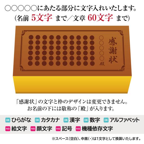 ●お名前は「最大5文字」まで、文章は「最大60文字」まで入れられます。注文時にご入力ください。