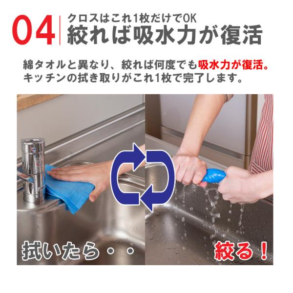 ●水切れが良いので絞った分だけ吸水力が復活。拭く・絞るを繰り返せば最後まで吸水力が落ちることなく、水回りや窓ガラスの水滴を拭き取れます。