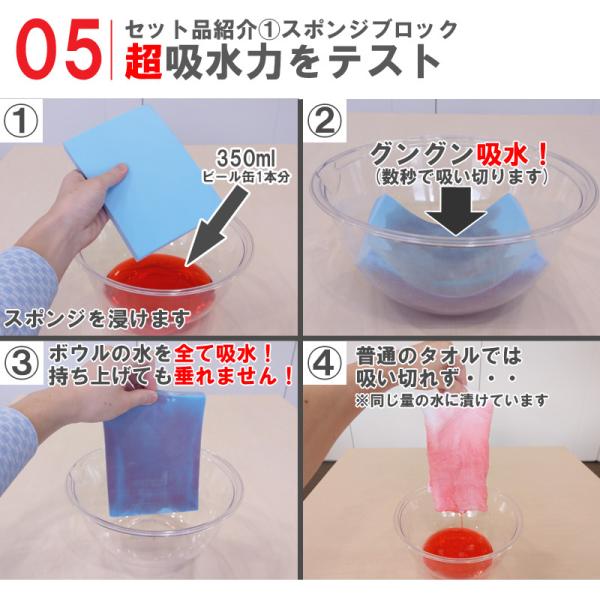 キッチンやバスルームの水滴をサッと吸い取るスポンジクロスとブロックのセットです。