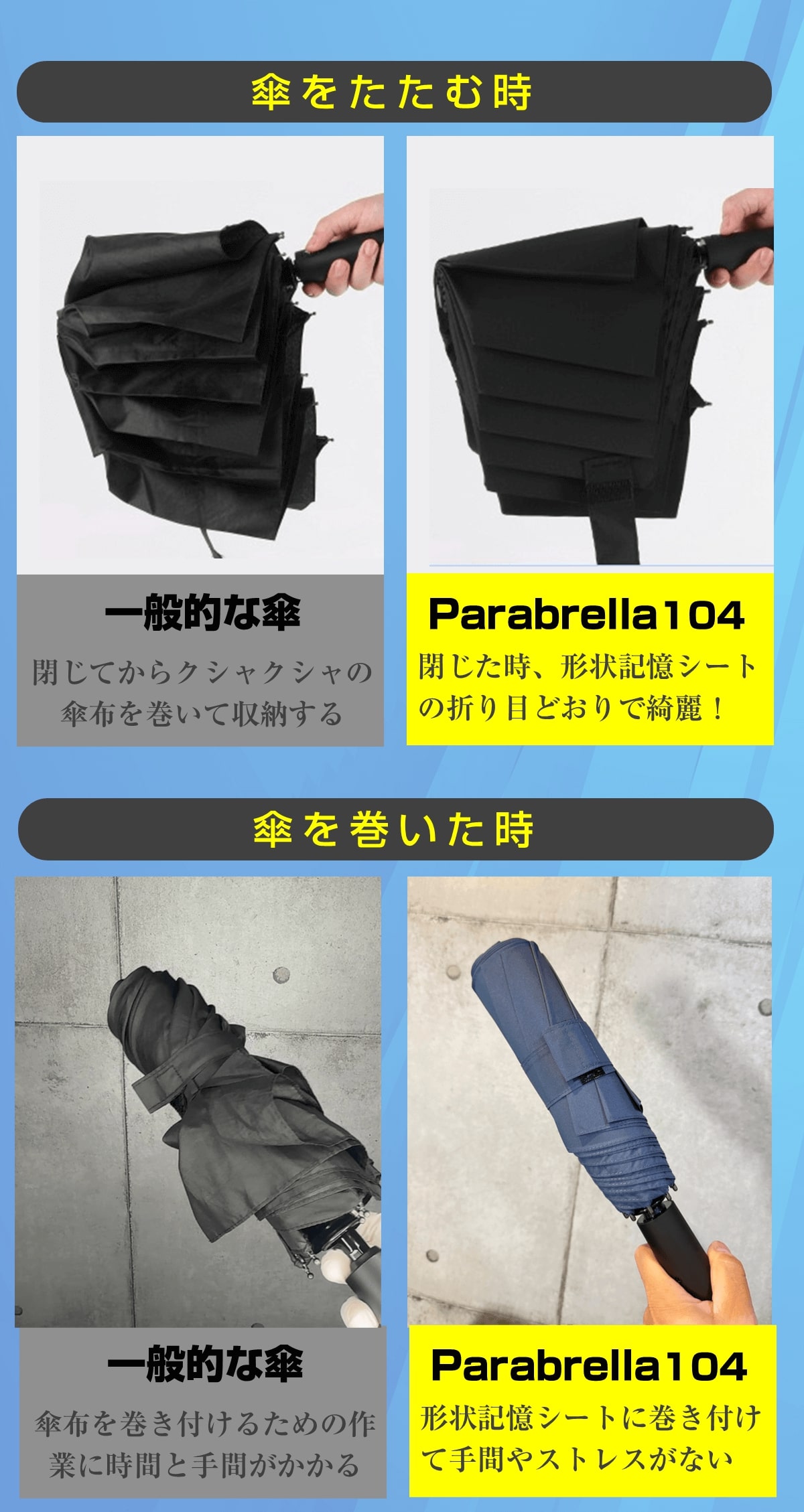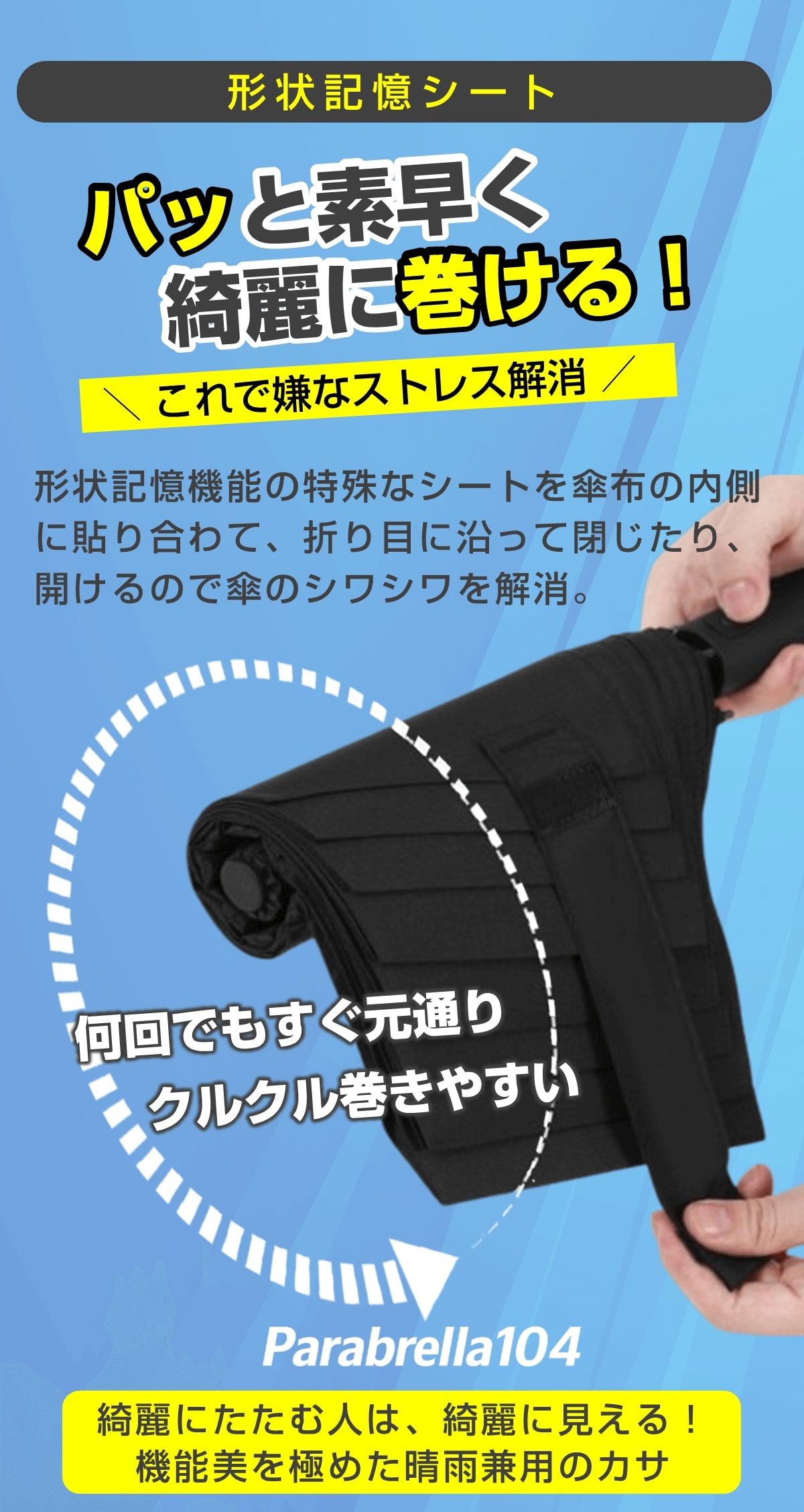 Parabrella104(パラブレラ104)は革新的な形状記憶構造をシートを採用した次世代の折り畳み傘は使うたびに広がる美しいおしゃれな雨の日をおしゃれに楽しめます。