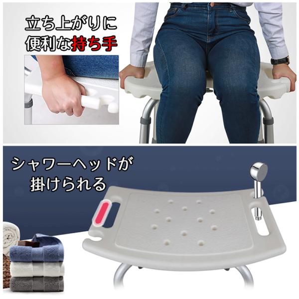 【機能性抜群】座席に12個な排水穴があり、水が溜まらないから防カビできます。座面の横には立ち上がる時に楽な持ち手がついていて、移動がしやすい。サイドにはシャワーヘッドが掛けられる、とても便利。