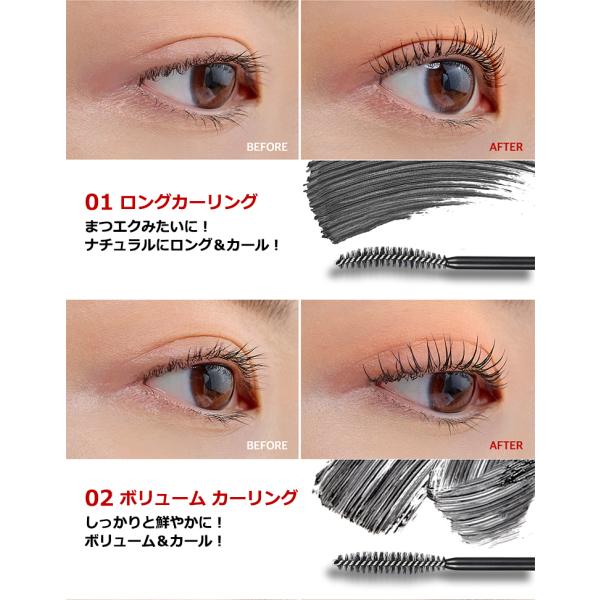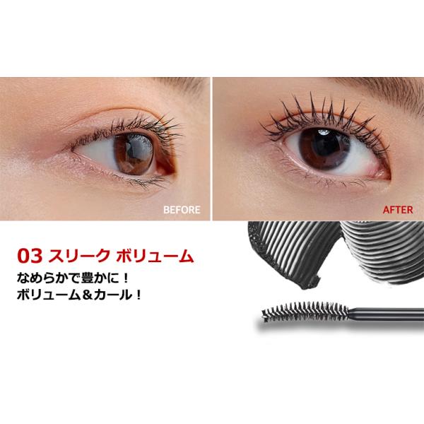 柔らかい 「 ジェル フォーミュラ ベース 」と「 きれいに 仕上がる ワックス 成分 」が 出会い ダマ ・ ヨレ の 心配いらず で、 目頭 ・ 目尻 の間に 隠れたまつ毛 まで しっかり と!
