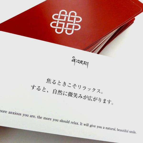 チベット高僧の珠玉の言葉を厳選し、緋(あか)54枚、白54枚の合計108枚にわかりやすくまとめたものです。気づきや癒しを与えてくれ、自分の心と向き合うことができるため、セラピスト、カウンセラー、マインドフルネスのインストラクター・コーチなど、ヒーリングのプロもセッションに活用しています。