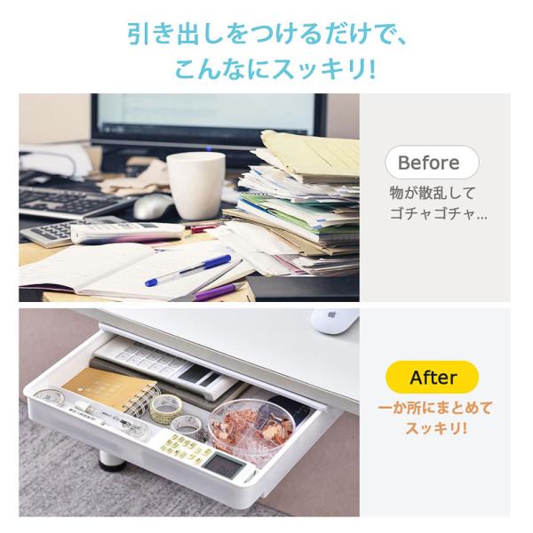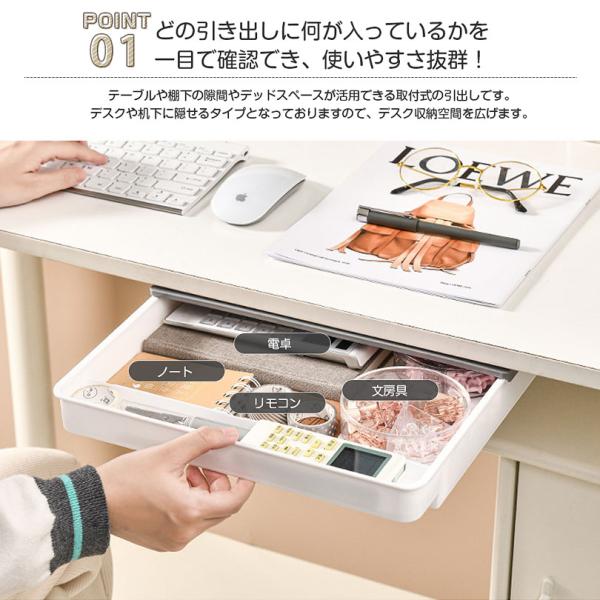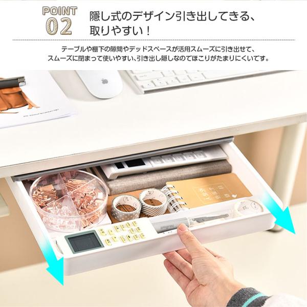 ・テーブルや棚下の隙間やデッドスペースが活用できる取付式引出しです。デスクや机下に隠せるタイプとなっておりますので、デスク収納空間を広げます。