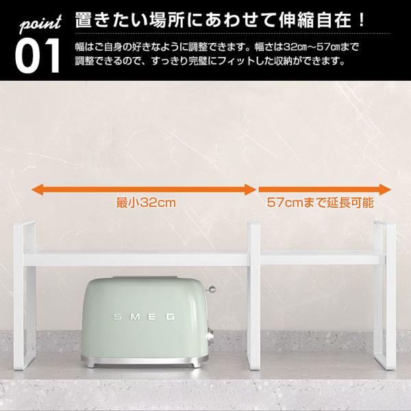 ●本製品は幅を32cmから57cmまで自由に調整できる伸縮収納ラックです。さまざまなスペースに合わせて最適なサイズに調整でき、使い勝手が向上します!