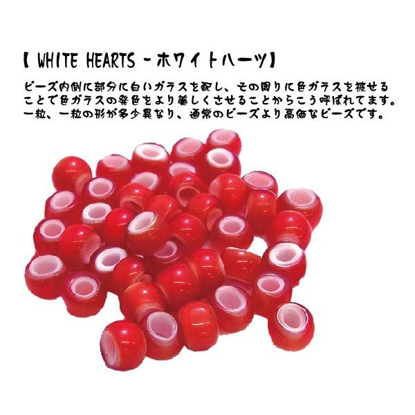 ホワイトハーツ(WHITE HEARTS)…ビーズ内側に白いガラスを配し、その周りに色ガラスを被せることで色ガラスの発色をより美しくさせることからこう呼ばれています。