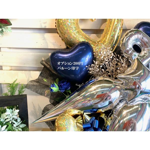 オプションにてバルーン印字(200円)や周年祝などに用いられる数字バルーン追加(1文字400円)にもご対応させていただきます <br>
