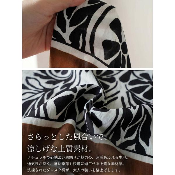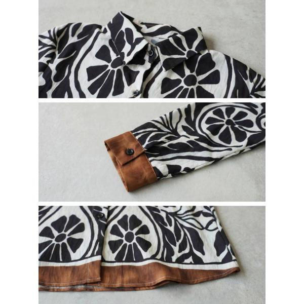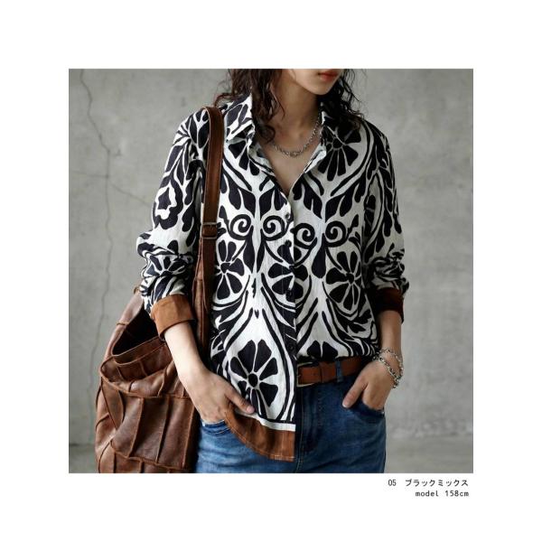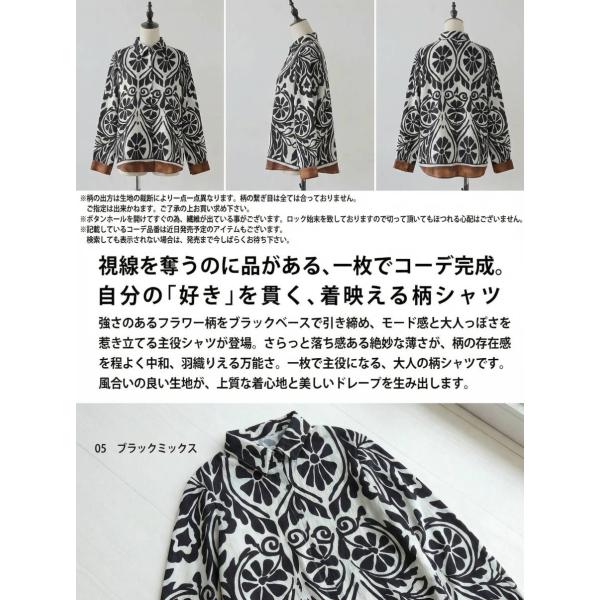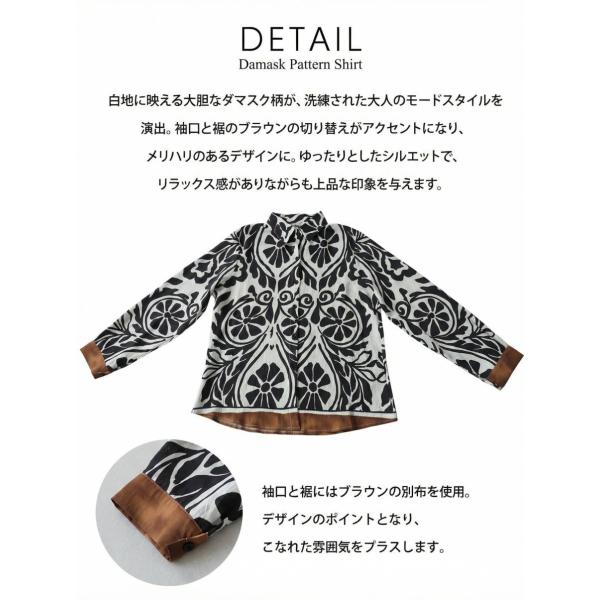 大胆なダマスク柄と袖口・裾の配色切替が目を惹く長袖シャツで、すっきりとしたネックラインとゆったりとしたシルエット、程よい丈感が上品な印象と体型カバーを両立し、前開き仕様で羽織りとしても使える着回し力の高い万能アイテムです。