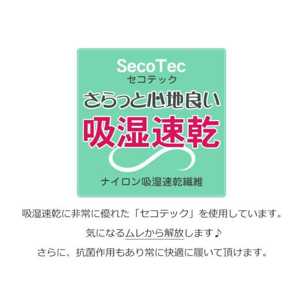 吸湿速乾に非常に優れた「セコテック」を使用しています。気になるムレから解放します。さらに、抗菌作用もあり常に快適にはいて頂けます。