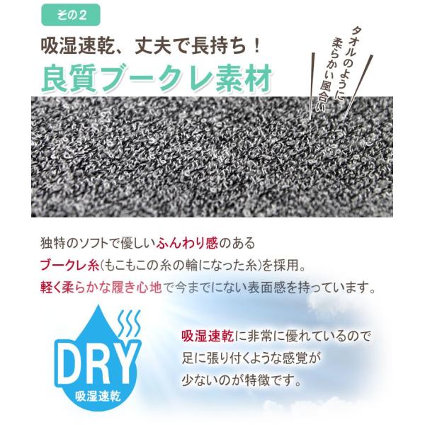 独特のソフトで優しいふんわり感のあるブークレ糸(もこもこの糸の輪になった糸)を採用。軽く柔らかな履き心地で今までに無い表面感を持っています。