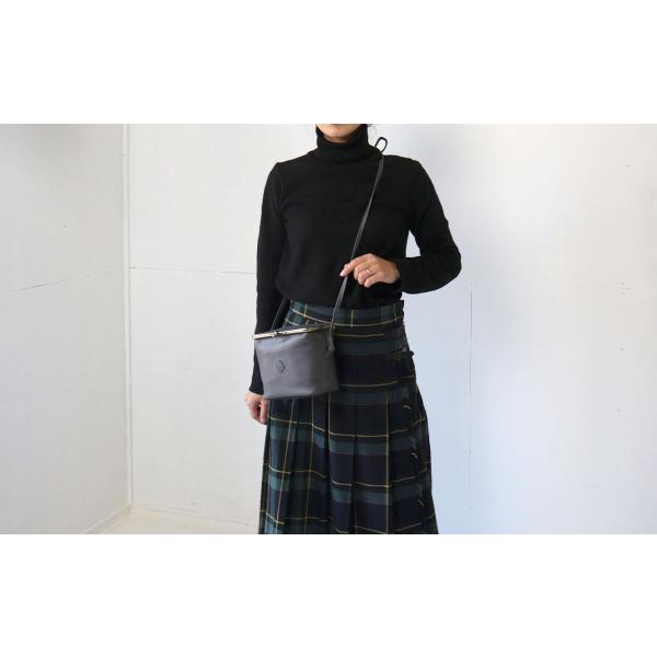 素材は軽くて心地よい手触りが特徴のソフトレザー。コロンと可愛いボックス型。本体には薄いクッション材が入っており、ふっくら柔らかい触り心地。メイン収納はがま口開閉。パチンと簡単に開閉できます。蓋の裏にはカードポケットが1つ。キャシュレス化の進んだ今にぴったりでシンプルなつくり。ショルダーストラップは結んでいるだけなので、長さ調節も簡単です。肩掛けにしたり、斜め掛けも◎。また、ストラップを外して大きめポーチや小物入れとしてもお使いいただけます。身軽に持てるコンパクトなサイズと華奢なストラップで見た目も持ち心地も軽やかです。
