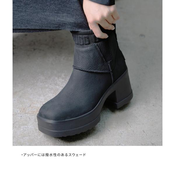 スクエアトゥでモード感を加えたプラットフォームサイドゴアブーツ。撥水性のあるスウェードアッパーと耐水レザー採用で天候に配慮し、サイドゴアで着脱スムーズ。約5cmのプラットフォームと約8.5cmヒールの厚底設計がスタイルアップしつつ、安定感のある履き心地。合成ソックライナー、後部プルタブ、ヒールのエンボスUGGロゴラベル、フットベッドのロゴプリントがアクセント。シャフト約14cm。原産国:ベトナム。片足約625g。