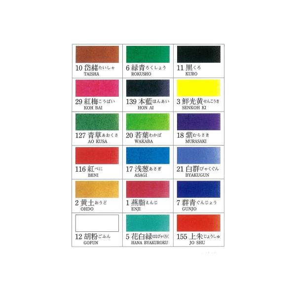 配色:岱赭、緑青、黒、紅梅、本藍、鮮光黄、青草、若葉、紫、紅、浅葱、白群、黄土、燕脂、群青、胡粉、花白緑、上朱(18色)