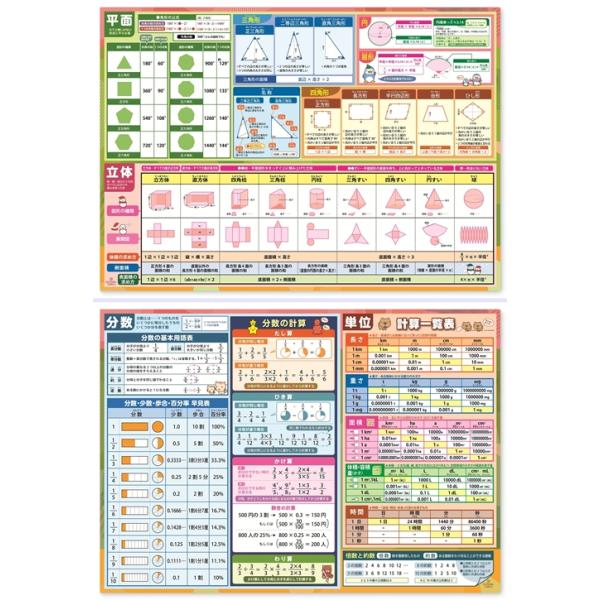 お風呂ポスター (算数 数学 平面 立体 分数 単位) 2枚セット 知育ポスター 中学校受験 受験対策 A2 サイズ 防水仕様 日本製 デスクマット向 知育 学習玩具