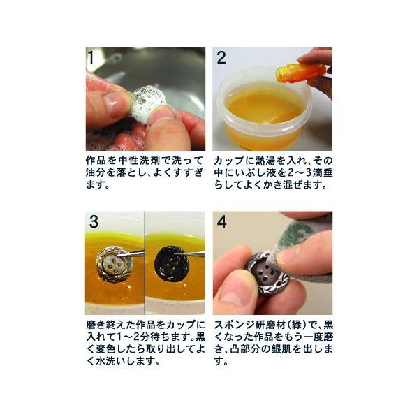 お湯に混ぜて作品を投入するだけで簡単にいぶし加工ができます。