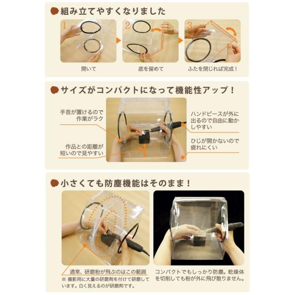 皆様の声から生まれた防塵ボックスです!防塵ボックスは、リューター等の作業時の削りくずの飛散を防ぎます。形状を一新し、より組み立てやすくなりました。また、防塵機能はそのままで、サイズはコンパクトになりました。素材:塩化ビニールサイズ:縦200×横200×高さ190mm