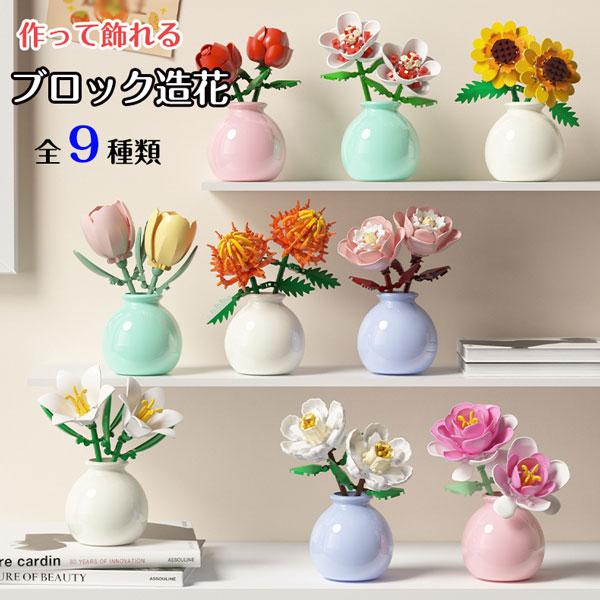 ブロックで作る 花瓶に生けた花 ナノブロックサイズ144パーツ 全9種類 ヒマワリ バラ マリーゴールド シャクヤク 椿 クチナシ ユリ ハイビスカス チューリップ
