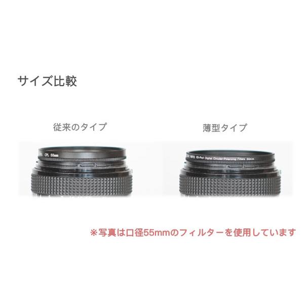 ガラス面、水面撮影などの必須アイテム PLフィルター 装着したままレンズが回せる便利なサーキュラータイプ 不要な光の反射をカットすることが出来る『偏光フィルター』とも呼ばれるフィルター 撮影時にフィルター前側の枠を回転させることで反射が消え、被写体本来の色を 出すことができます。水面やガラスなどの反射のカットには非常に効果的。さらに青空の色を濃く、葉などの反射を除去、など色彩のコントラストを高めることが出来ます。空の撮影 海の撮影 植物の撮影 ガラス・ビニール面の撮影 車の撮影など 手放せないフィルターです。さらに薄く使いやすい、超薄タイプ。 小売業者を通さない工場からの直接の仕入れ販売 及び日本人による厳しい品質管理により高品質ながらのこの低価格を実現しました。 Canon Nikon Sony Olympus Pentax Panasonic Fujifilmなど全メーカー対応可能なスクリュー式マウントです。キャノン ニコン ソニー オリンパス ペンタックス パナソニック 富士フィルム