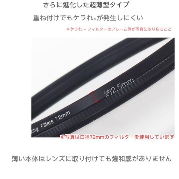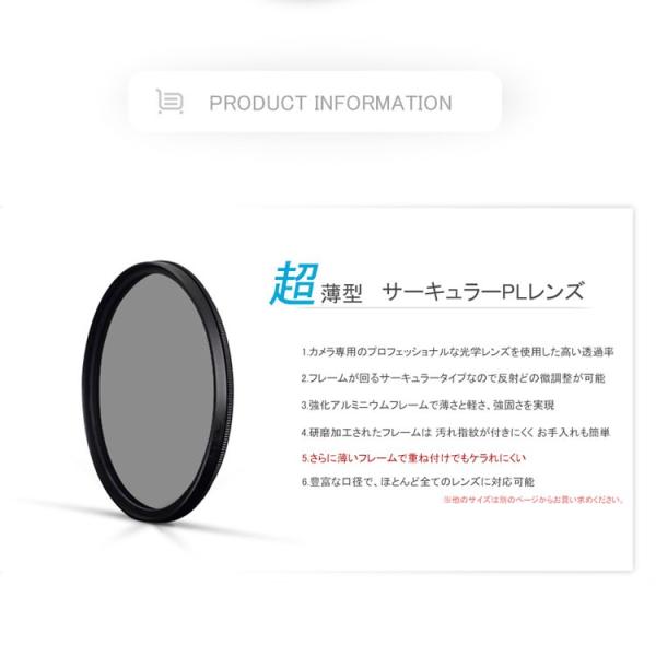 ガラス面、水面撮影などの必須アイテム PLフィルター 装着したままレンズが回せる便利なサーキュラータイプ 不要な光の反射をカットすることが出来る『偏光フィルター』とも呼ばれるフィルター 撮影時にフィルター前側の枠を回転させることで反射が消え、被写体本来の色を 出すことができます。水面やガラスなどの反射のカットには非常に効果的。さらに青空の色を濃く、葉などの反射を除去、など色彩のコントラストを高めることが出来ます。空の撮影 海の撮影 植物の撮影 ガラス・ビニール面の撮影 車の撮影など 手放せないフィルターです。さらに薄く使いやすい、超薄タイプ。 小売業者を通さない工場からの直接の仕入れ販売 及び日本人による厳しい品質管理により高品質ながらのこの低価格を実現しました。 Canon Nikon Sony Olympus Pentax Panasonic Fujifilmなど全メーカー対応可能なスクリュー式マウントです。キャノン ニコン ソニー オリンパス ペンタックス パナソニック 富士フィルム