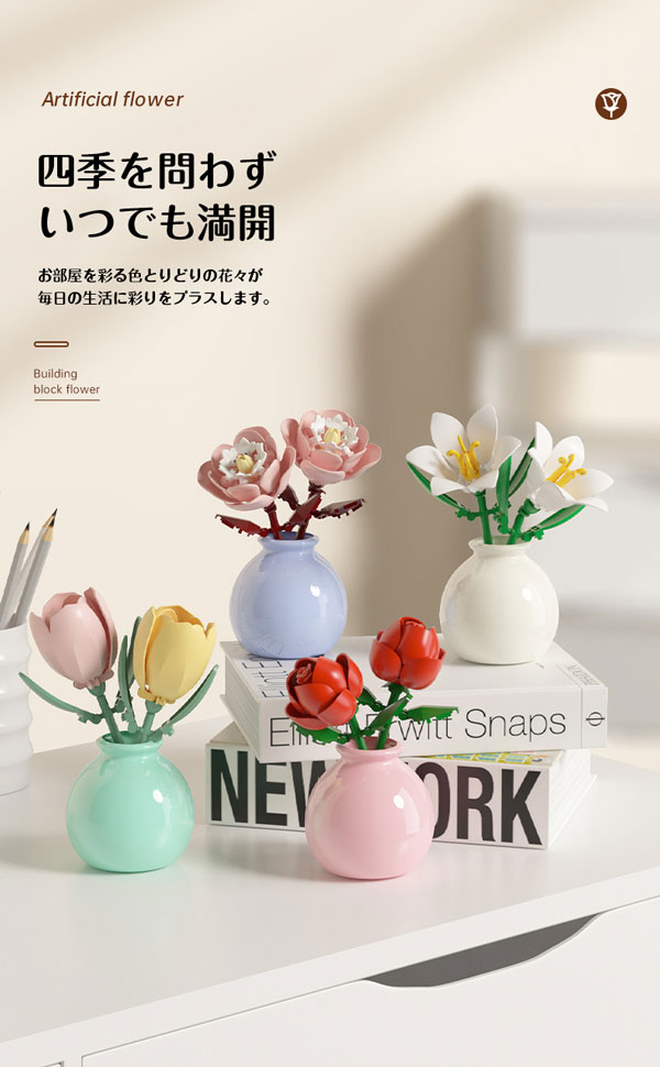 ブロックで作る 花瓶に生けた花 ナノブロックサイズ144パーツ 全9種類 ヒマワリ バラ マリーゴールド シャクヤク 椿 クチナシ ユリ ハイビスカス チューリップ