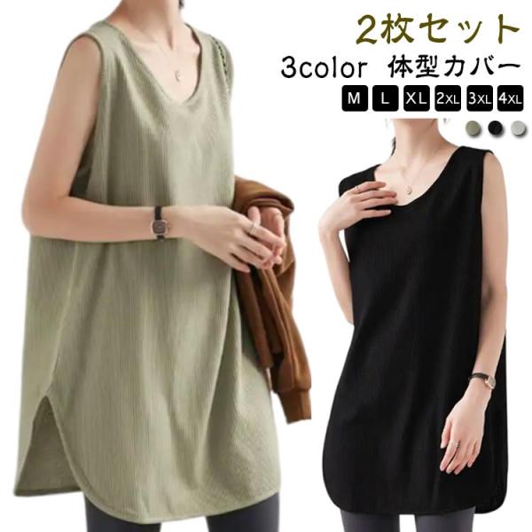 2枚セット!タンクトップ レディース トップス ノースリーブ Uネック ゆったり インナー タンクロング タンク レイヤード 体型カバー スリット ロ