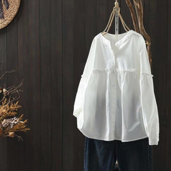 トップス シャツ 春夏 送料無料 体型カバー 送料無料 レディース シャツ シャツ シャツブラウス 長袖 無地 フェミニン 森ガール ゆったり 大きい