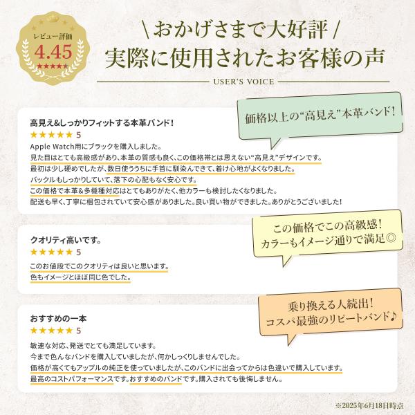 シンプルながら洗練されたデザインで、ビジネスからカジュアルまで幅広いシーンに対応。アップルウォッチ全シリーズに対応しており、使い勝手の良さも抜群です。毎日身につけるものだからこそ、質の良さにこだわりたい。そんな方におすすめの一本です。