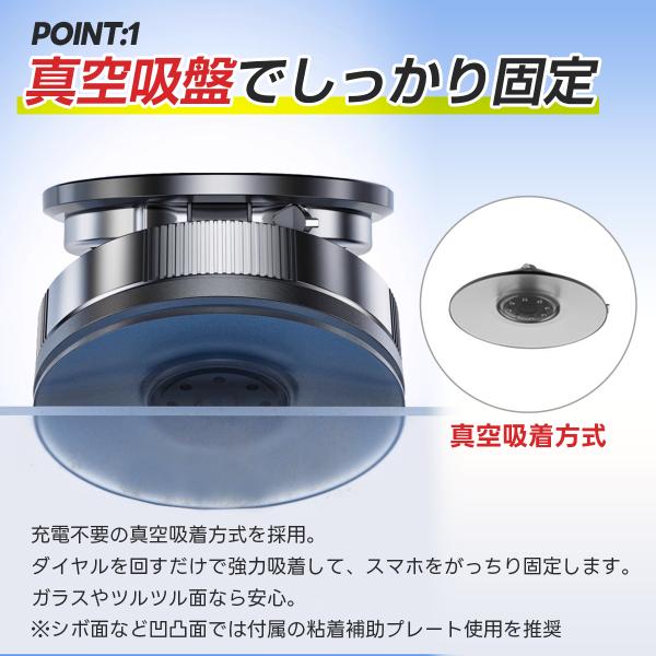 スマートフォンをしっかり固定できる、高機能なスマホホルダーのご紹介です。充電不要の真空吸盤を採用しており、ダイヤルを回すだけで強力に固定。車のダッシュボードやデスク上、お風呂や鏡など、さまざまな場所に取り付けが可能です。N52グレードの高性能磁石を内蔵しており、magsafe対応機種やメタルプレートを装着したスマホを安定して保持。車の振動でもずれにくく、落下の心配がありません。さらに、360度回転する構造で角度調整も自由自在。視線に合わせたベストポジションに簡単に設定できます。使用しないときは折りたたんでコンパクトに収納でき、厚みはわずか3センチと持ち運びにも便利です。セット内容も充実しており、必要な付属品がすべて揃ってすぐに使用可能。ブラックとホワイトの2色から選べ、スタイルやインテリアにも自然に馴染みます。毎日のドライブや作業環境をより快適にしたい方におすすめのアイテムです。