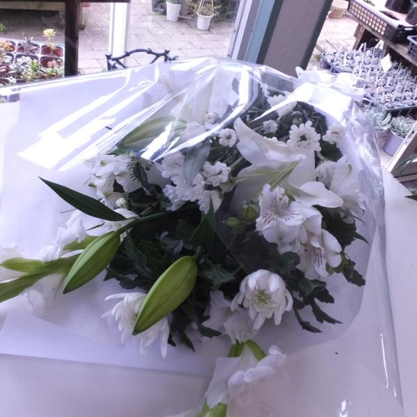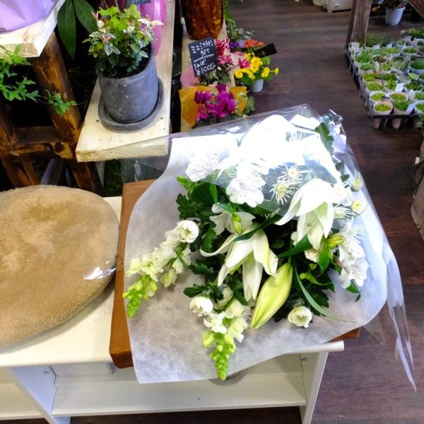 お悔やみ 花 49日 ご命日 喪中はがき 花瓶用 月命日 ご法事 白菊とオリエンタルユリの長持ちお供えホワイト系花束