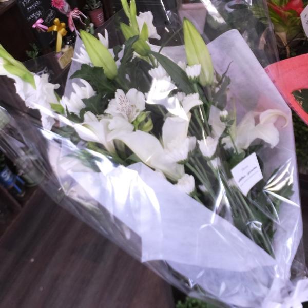 豪華なホワイトのオリエンタルユリと長持ち菊のミックスお供え花束