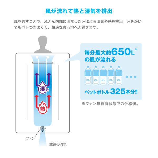 本体に取り付けられたファンが、寝具内に風を流し、湿度・温度の上昇を軽減する「エアテクノロジー」を活かした寝具です。