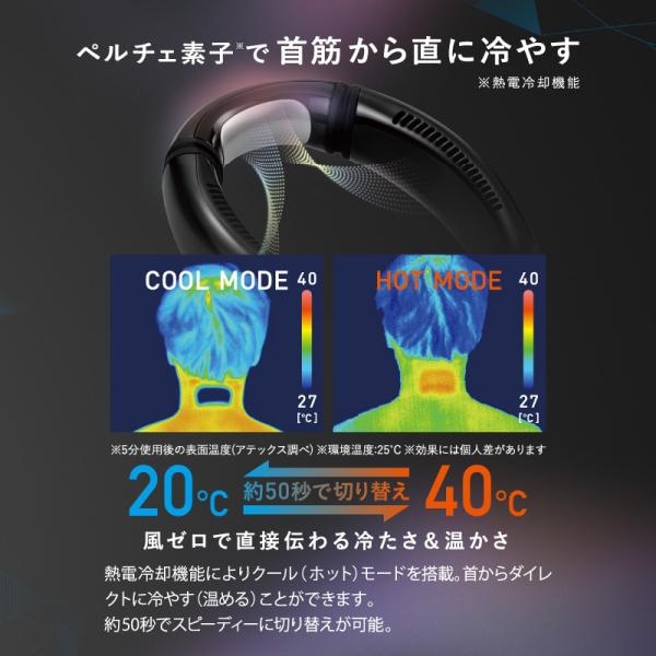 ・熱電冷却機能によりクール(ホット)モードを搭載。首からダイレクトに冷やす(温める)ことができます。