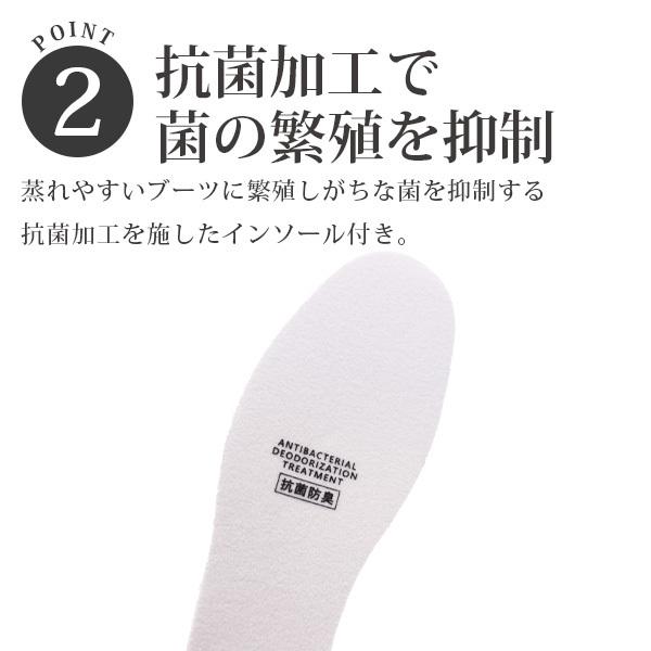蒸れやすいブーツに繁殖しがちな菌を抑制する抗菌加工を施したインソール付き。