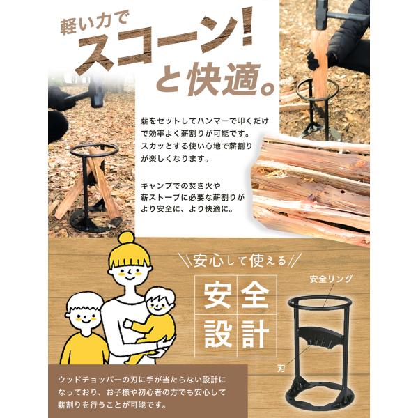 これまで労力だった薪割りが小さい力でより安全に、素早く取り組めます。高強度で安全設計なので誰でも手軽に薪割りが可能になります。焚火 薪ストーブ 暖炉 ご使用の際に大活躍!