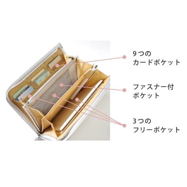 仕切りスペースが3つ、ファスナー付きポケットが1つ、カード入れが9つの計13ポケット。