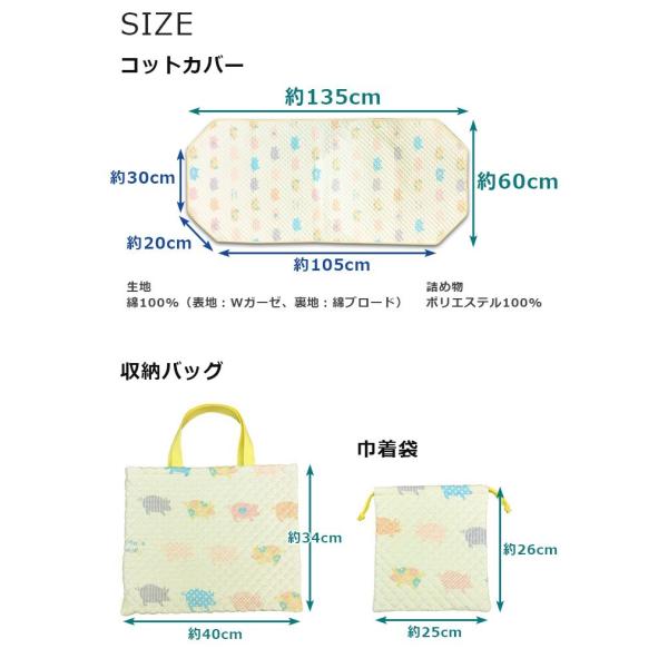 コットカバー 60×135cm 収納バッグ&巾着袋付き お昼寝コットカバー キルティング キルト加工 Wガーゼ 日本製 お昼寝コット用 コットシーツ お昼ね ロングタイプ 敷きカバー 敷き布団カバー 通園 園児 保育園 幼稚園 託児所 施設 ベビー キッズ