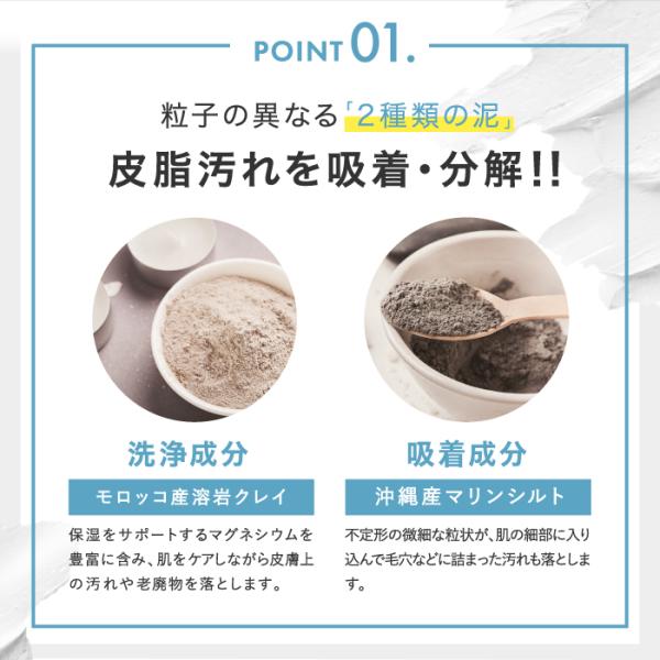 [乾燥・テカリ・肌荒れ・毛穴黒ずみ・髭剃り荒れ]。2種類の泥×濃密ミクロ泡で優しく皮脂汚れを落とす。清潔感あふれるすべすべ自信肌へ。