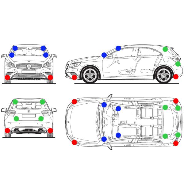 ●前後バンパー下四隅、フロントガラス内側四隅、リアハッチまたはリアガラス内側四隅の合計12カ所にもれなく貼り付けてください。