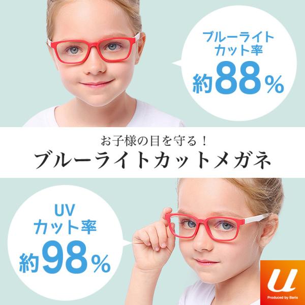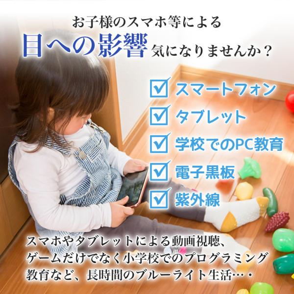 ブルーライトカット率約88%、UVカット率約98%でお子さまのスマホやタブレット、PC等による目への影響を守ります。