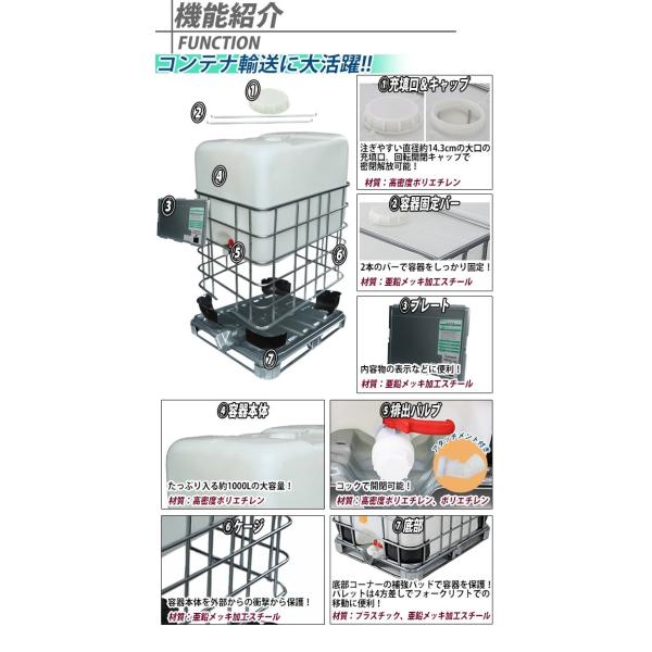 ■材質:高密度ポリエチレン(充填口キャップ、容器本体、排出バルブ)、亜鉛メッキ加工スチール(容器固定バー、プレート、ケージ、パレット)、プラスチック(容器底部コーナー補強パッド)