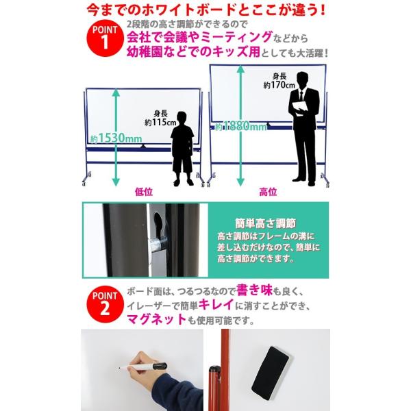 ホワイトボード 脚付き 高さ2段階 高さ調節 1800×900mm 両面 ハイグレードモデル 選べるフレームカラー 回転式 トレイ マーカー イレーザー付き 高さ調整 段階