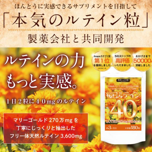 天然由来の高品質フリー体マリーゴールド2,700,000mgから良質の極濃ルテインエキスをしっかりたっぷりと抽出。1日たった2粒で、なんと40mgものルテインを摂取できるルテイン極濃配合のサプリメントが登場